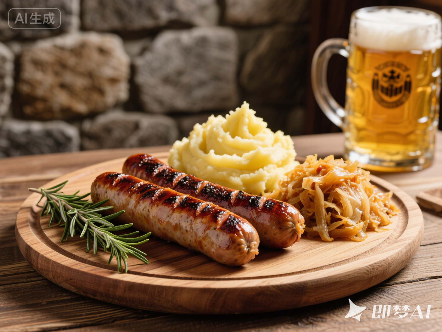 烤腸外皮焦脆,黑胡椒香氣濃郁,搭配酸菜與土豆泥,重現地道德式風味。